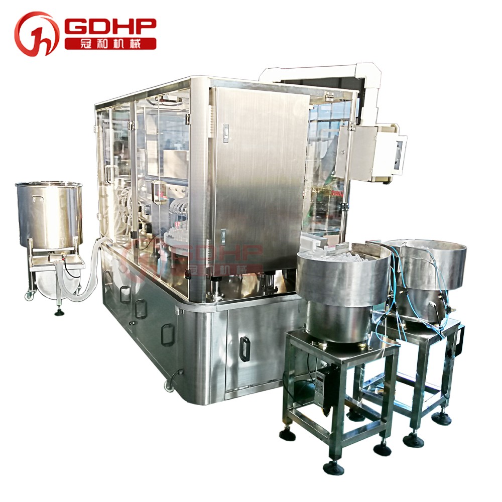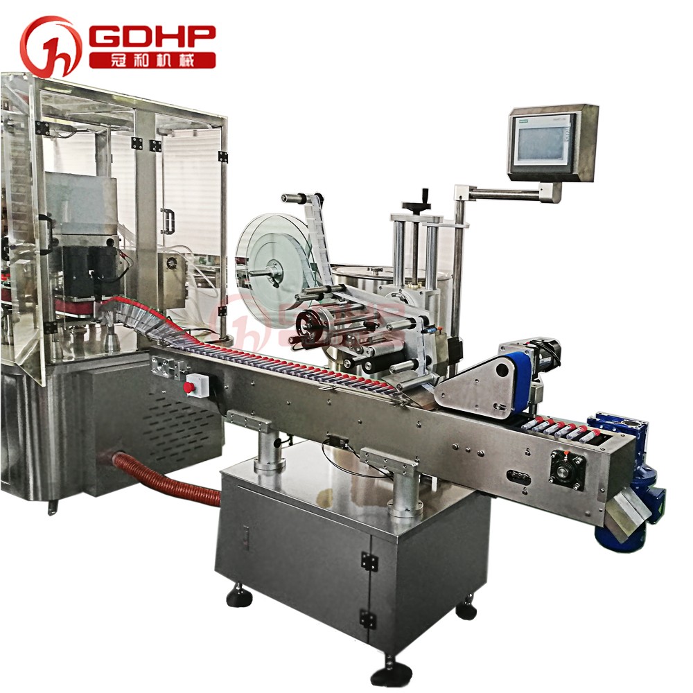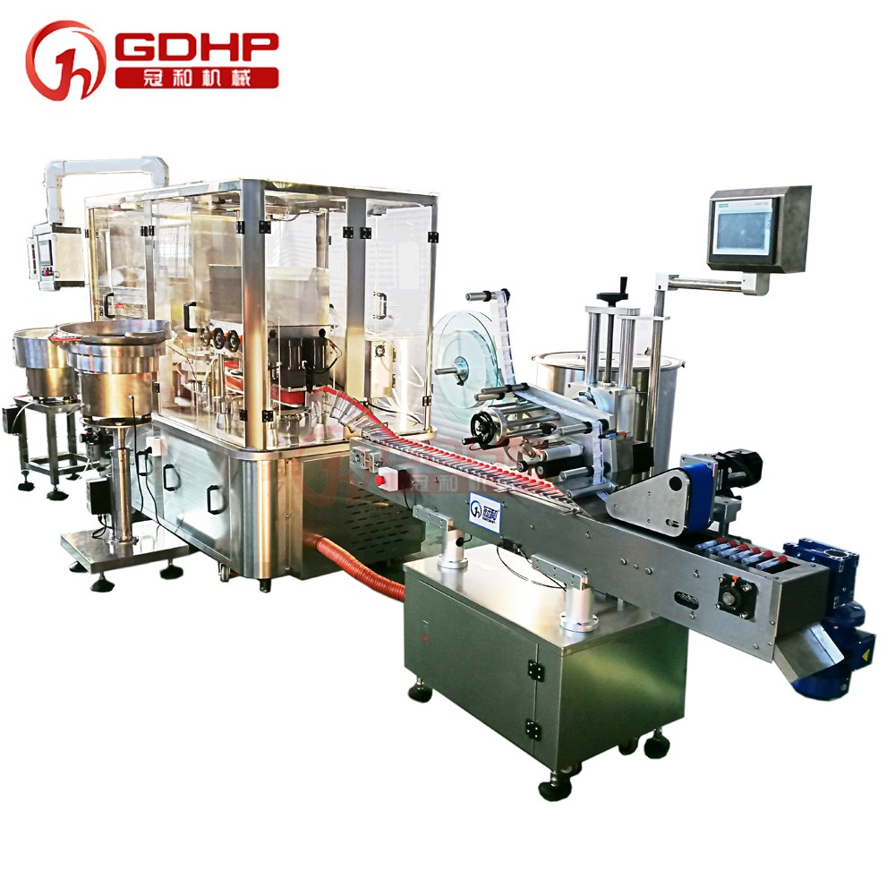 本機是采樣管、檢測試劑瓶灌裝生產線中的專用設備,采用旋轉式跟蹤式的灌裝方式 ,連續式下蓋旋蓋,灌裝穩定,產能高。工作原理瓶子在軌道運行的過程中汽缸定位,陶瓷泵精確灌裝,灌裝完畢后,汽缸自動放開,依次進行下一次灌裝,灌裝完成后的瓶子經分度盤進入下蓋旋蓋工位,旋蓋完成后出瓶
